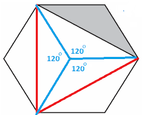 Now consider the grey triangle.  The sum of the interior angles is  180(n - 2)°=720°. Therefore one interior angle is 120°. The area of the grey triangle is 1/2  (side)(side)  sin (included angle) =                   1/2 (1)(1)  sin (120°) = √3/4.