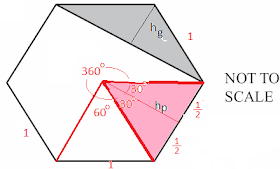 We don’t know if the hexagon has sides of 3 cm or 2 miles or ….  Actually it doesn’t matter.  Each of the sides is 1s.  Partition the hexagon into 6 identical equilateral triangles (One has been shaded pink).  The apothem (or “radius”) is the height of the pink triangle, h_p.